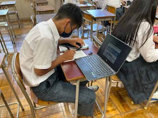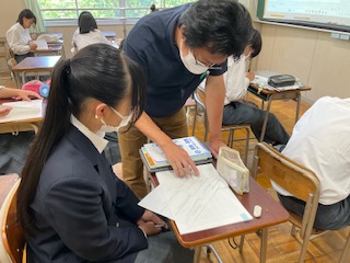 先生に質問したり、教えあったりしながら問題を解いています。