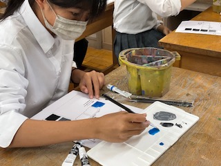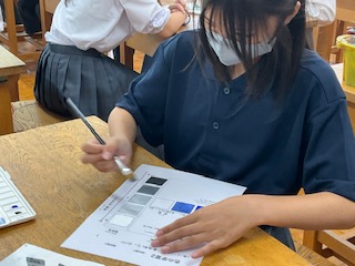 無彩色、有彩色と明度・彩度を考えて混色をして塗ります。