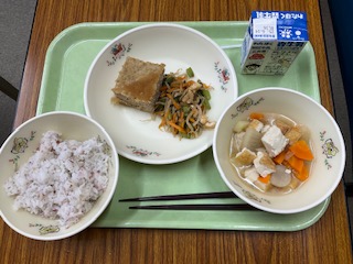 いわしハンバーグ、小松菜と油揚げの煮びたし、田舎汁、梅ごはん、牛乳 です。