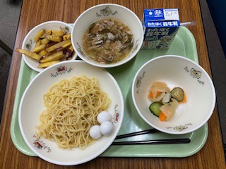 はちっこつけ麺、うずら卵の塩ゆで、キャンディーポテト、野菜の南蛮漬け、牛乳 です。
