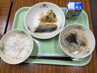 鯖のカレー焼き、チンゲン菜のからし和え、かぶのみそ汁、ごはん、牛乳 です。