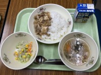 豚すき煮、野菜とじゃこのサラダ、有機冬瓜のスープ、ごはん、牛乳 です。