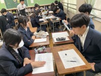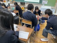 模擬面接をしています。先生とクラスの仲間が面接官をしています。