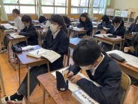 記事を読んで要旨を確認して問題に答えています。友達と答えを確認しています。