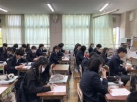 1回目の授業、教員の自己紹介、体験談をしっかりと聞いています。