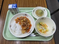 チキンのトマトソース煮込み、フレンチサラダ、ガーリックライス、桑都カップケーキ、...