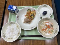 鶏のレモンしょうゆ、野菜のごまドレッシング、呉汁、ごはん、プルーン、牛乳 です。