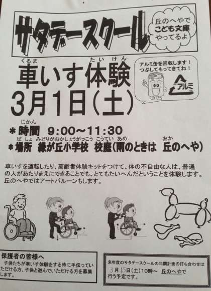 3月1日土曜日 サタデースクール 公開日 2014/02/27 更新日 2014/02/27 PTA 今週のサタデースクールは、車椅子体験とアートバルーンです! とても貴重な体験です(^^) 3月15日には、来年度の年間計画の打合せがあります。ご興味のある方は、ぜひご参加ください。 10時〜 丘のへやです。 また、企画案もお待ちしています! いいね(0)