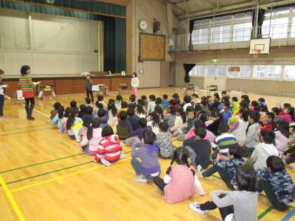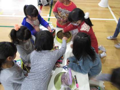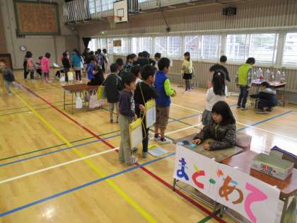 12月11日(木)に、1、2年生合同の「みどりがおかフェスティバル」を行いました。子供たちは、魚釣り、的当て、アクセサリー作り、どんぐりごま、ビー玉迷路、けん玉、輪投げ、ボーリング、紙工作、パズル、豆うつし、レースの計12店舗のお店を展開しました。前半後半でお店側とお客さん側に分かれて活動し、子供たちは交流を深めながら楽しい時間を過ごしていました。