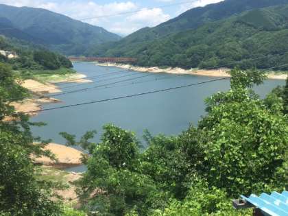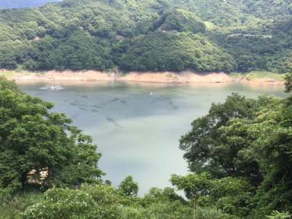 草木湖に到着しました。これから富弘美術館の見学です。草木湖にある草木ダムを見ると、水の量が減っていることが分かります。関東は梅雨明けを迎えました。ダムの水が少ないということは、今年の夏は水不足が予想されるのでしょうか?
