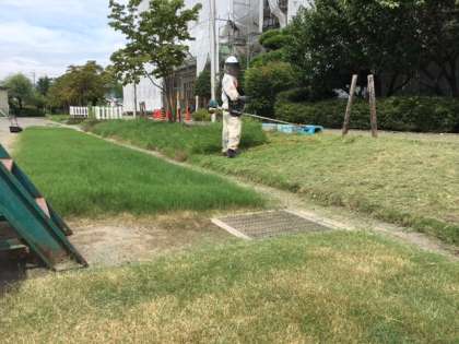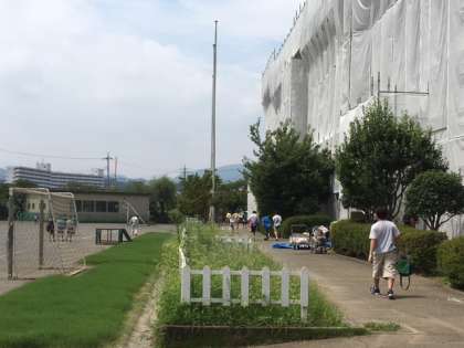 あさって25日金曜日は二学期始業式です。学校は大規模補修で外壁の塗装中です。子供たちが学校に帰ってくるので副校長先生は校庭の芝刈りをしたり、長谷川用務主事は草刈りをしたりと学校をメンテナンスしています。校舎内も廊下や教室にワックスがかけられ、子供たちかが新学期を気持ちよく迎えられるようにしています。先生たちも子供たちみんなに会えることを楽しみにしています!