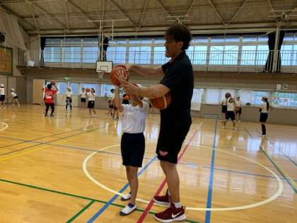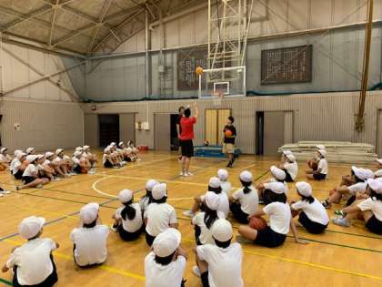 八王子ビートレインズの石橋アンバサダー、中村スクールコーチ、夏達維(なつ たつゆき)選手が来校し、6年生の子供たちにバスケットボールを教えてくれました。現在授業でバスケットボールを行っています。もっとバスケがしたくなる、そんな2時間になりました!
