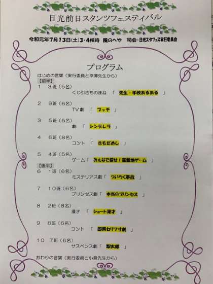 7月13日土曜日の3・4校時に風のへやで、日光スタンツフェスティバルを行います。