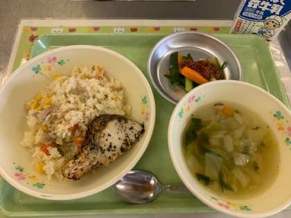 今日の給食はカラフルピラフ、白身魚のハーブ焼き、スティックサラダ、ABCスープでした。サラダのソースがケチャップベースで赤いので辛い?と聞いてくる子や辛そう!という声が聞こえましたが、残菜として戻ってくる量は少なく、辛くないとわかるともりもり食べてくれたようで嬉しかったです。
