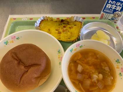 今日はパン、パンプキングラタン、ミネストローネ、りんごでした。パンをグラタンに付けたりミネストローネにつけたり、様々な食べ方をして楽しんでいました。