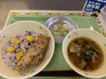 今日の給食は、秋月ご飯・石垣揚げ・八王子汁・浅漬けでした。高尾山が日本遺産に認定された記念献立が、今日から3日間連続であります。今日のメニューは、「八王子城御膳」でした。明日の日本遺産献立も、楽しみにしていてください。