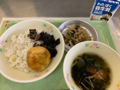 今日は五穀ご飯・がんもどき・八王子きくらげの佃煮・小松菜のおひたし・精進だしの翠靄汁でした。日本遺産メニュー最終日、高尾山御膳でした。品数も多かったので、なかなか時間内で食べきるのが難しかったかな、と思いました。3日間、給食の日本遺産献立を通じて、八王子の食を学んでもらえていたら嬉しいです。