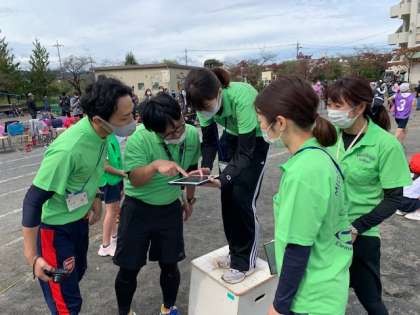 ICT機器であるタブレットを使っての走競技での判定。時間がかかることもありますが、正式な判定ができます。毎年、地域や保護者からも高評価です。何より子供たちにとって公正公平です。