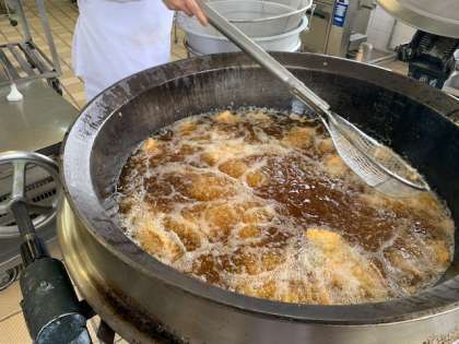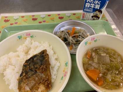 今日はごはん・鯖のカレー揚げ・三色ナムル・くずきりスープでした。鯖は今が旬で、脂がのっていました。カレー粉をまぶして揚げてあるので子どもにも大人気でした。