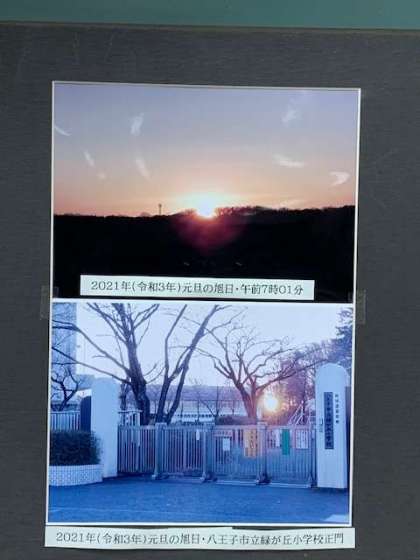 朝、校門に立って挨拶をしていると、校門にこのような写真が掲げられていました。地域の竹内政巳さんが撮影した初日の出です。