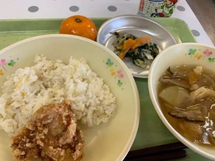 5/25の給食 公開日 2021/05/25 更新日 2021/05/25 給食室 ・五穀ごはん ・鶏肉のから揚げ ・のっぺい汁 ・ほうれん草の酢みそ和え ・果物(冷凍みかん) 今日は食事バランスばっちり!五つの輪で体力アップの献立でした。今月は「疲労回復」のために炭水化物、たんぱく質、ビタミン類を多く含む組み合わせでした。しっかり食べて運動会の練習頑張って! いいね(0)