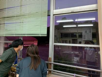 週末の金曜日の黄昏時、田中先生と松本先生が空を見上げて、「来週は晴れるといいなぁ。」と。