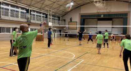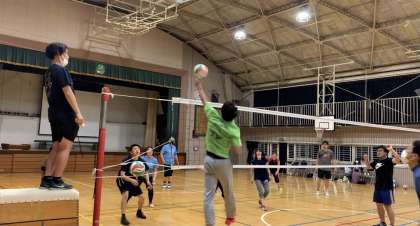 バレーボール交流会第一セットは、事務室の大沼さんのサーブが5本連続で決まり、逆転。そこから副校長先生のサーブも連続で決まり点差をつけます。ライトからは原先生、レフトからは澤崎先生、セッターの田中先生もツーで返球して得点を決めます。第一セットを取りました!
