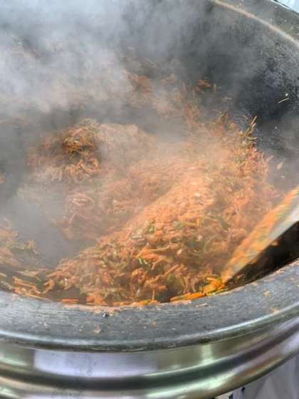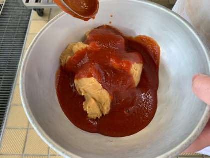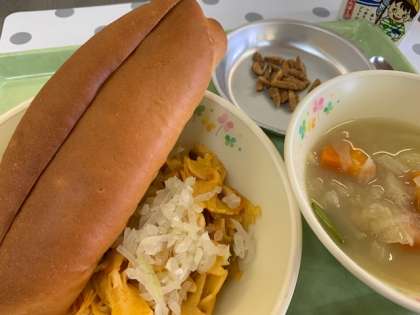 今日の給食ははちナポでした。今日のナポリタンは、写真のように隠し味に味噌をケチャップで溶いて加えてあります。パンにサンドしやすいよう、リボン型のパスタを使用しました。