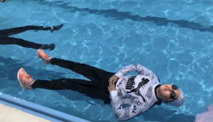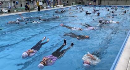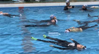 着衣のままの方がいつもよりも浮けると気づいた子もいます。そうです、物にも浮力が働くからです。服に入り込んだ空気、そして靴に使われている素材に浮力が働きます。