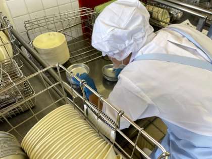 今日は給食室の様子について紹介します。2枚目の写真は皆さんが使う食器を一枚一枚汚れや破損がないか確認しています。汚れがあった場合は他のものに変更します。これを毎クラス、すべての食器で行っています。皆さんの安心安全な給食のために給食室は今日も目を光らせています!!