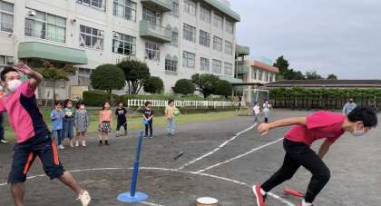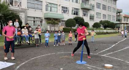 この日は体育の実技研修を実施。ベースボール型ゲームでは、打者の児童がバットを投げてしまい後ろの待機児童にぶつかる事故が市内で毎年のように出ています。その事故が本校では起きないよう安全面を確認しました。そして、新しいゲームのみんなでプレイも!