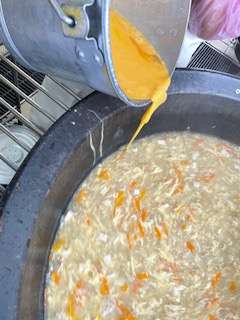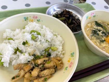今日はいかの香味炒めとかきたま汁の写真を載せました。かきたま汁の卵は異物が入り込まないよう、2人で確認しながら丁寧に入れていきます。これがたまごをふんわりと散らすことにも繋がっています。みんなしっかり食べてくれましたか?