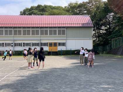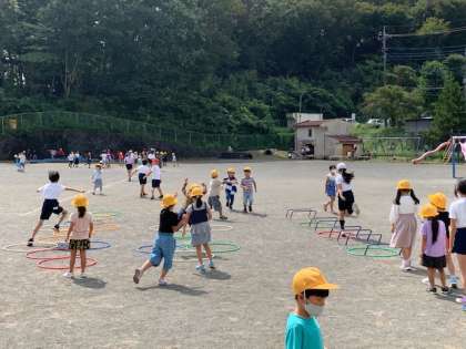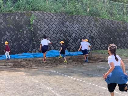 投能力と跳能力の課題を変えるべく、遊んでいるうちに力が身に付く場をたくさん用意しています。休み時間に楽しそうに遊ぶ子どもたちです。