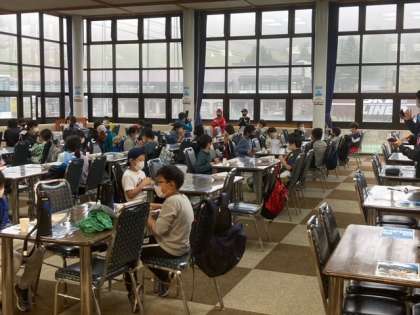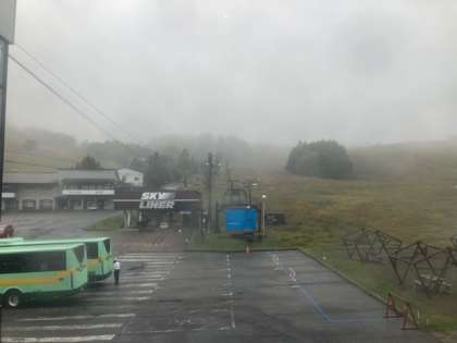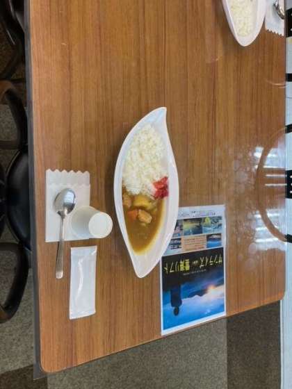 予定より少し遅れてカレーライスの昼食です。自称「晴れ男」の奮闘虚しく、霧雨が降り始めていました。風もあり、体感気温がかなり低いため、雨プロに変更します。