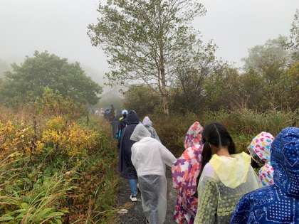 年間200日は雨が降る場所。霧ヶ峰と言うだけあって、雨です。そとはとても寒い。八代湿原まで歩き、天空の箱庭の美しい景色も真っ白のため、子供たちも中止を受け入れました。