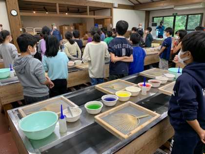 これから和紙の里にて紙漉き体験とうちわ作りをします。世界でひとつだけの作品作りにチャレンジです。