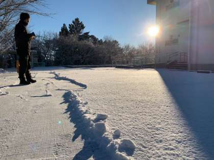 朝から雪かきを行う用務主事の齋藤さん。「田んぼの風景が綺麗ですよ!」と、教えてくれました。