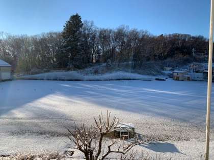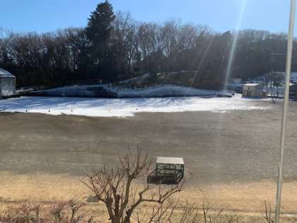 校庭はご覧の通り。午後には気温も9度を超え、校庭の雪も溶けてきました。まだ、森の影に沿って雪は残っています。