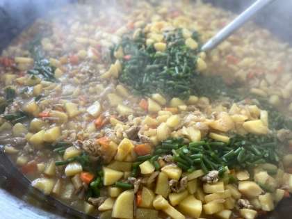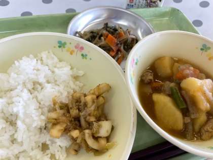 今日は野菜たっぷりの献立です。野菜をたっぷり食べて、毎日を元気に過ごし、病気も予防しましょう!今日の給食で食べる野菜の量は123gです。野菜350gまでのあと227gは、お家で食べましょう。