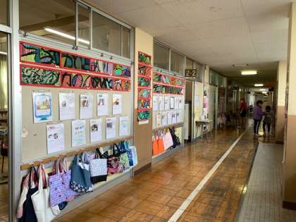 一年生の廊下には、今年度の展覧会で選ばなかった方の作品が飾られています。二年生の廊下では写真のような作品。名前を書いて、となり合わない色や模様で描きました。その下にある今よりも幼い頃の写真は、今日まで大きく成長した証です。