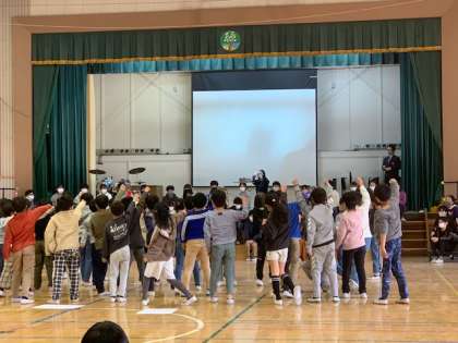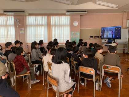 六年生を送る会第一部は低学年のみ。三年生以上はオンラインで低学年の出し物を見ました。