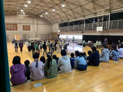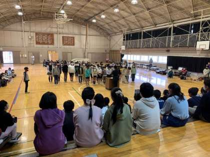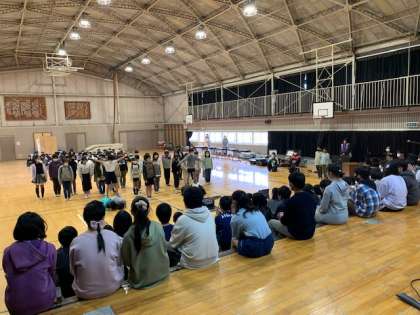 四年生の出し物は、これまで本校で見たことがない出し物でした。内容は、六年生に贈る劇です。これまで一年間の中、六年生の活躍の場面を3つ考えて寸劇にしていました。六年生にたくさんの笑顔を届けました。