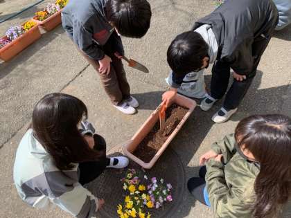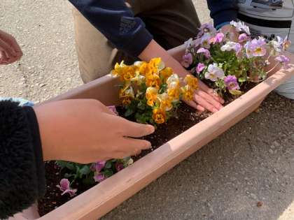 五年生は花いっぱい運動を担当します。副校長先生のガーデニング指導のもと、1組も2組もプランターにビオラを植え付けました。