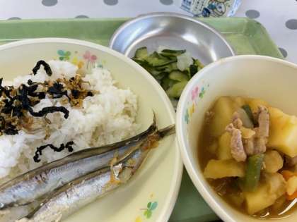 給食では、ふりかけも浅漬けも手作りです。低学年はまだまだ苦手な子も多い印象ですが、ししゃもも丁寧に焼いています。しっかり食べられましたか。
