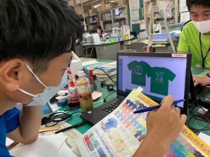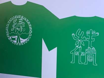 表面は6年2組の輝かしい才能をもつアーティストが製作。デザインは仲間で育む絆を組体操で表現。裏面のアイデアは6年1組の冴えわたる力をもつアーティスト。校章をみんなの名前で囲みます。上下に記念の言葉を入れます。