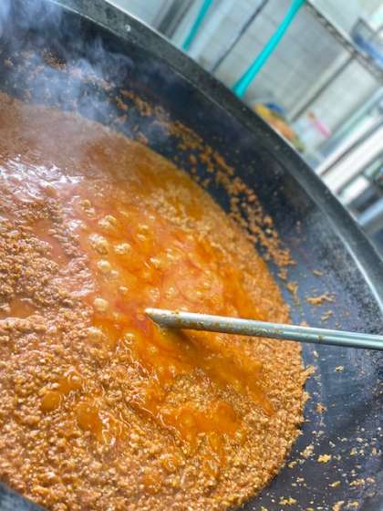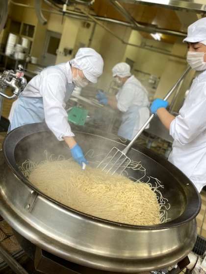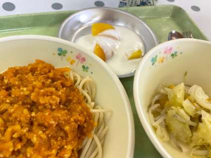 今日はみんなの人気給食、スパゲティミートソースです。しかしいつもと少しだけ違うのはミートソースに大豆が入っています。大豆は「畑の肉」とよばれることもあるほどたんぱく質が豊富です。しっかり食べましょう。