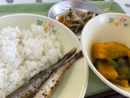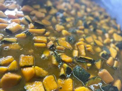 今日はかぼちゃの甘煮です。かぼちゃは今が旬の夏野菜で、今日は八王子産のものを使用しています。しっかり食べましょう。