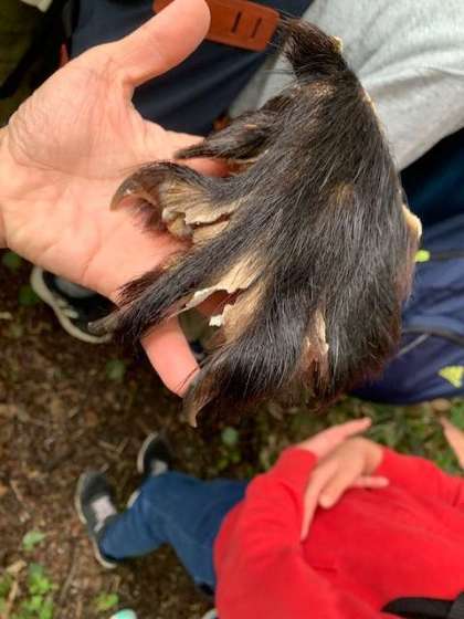 クマの手の毛皮を触らせていただきました。毛は水を弾くほど太く艶やかで剛毛です。爪は鋭く尖っています。
