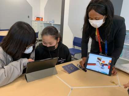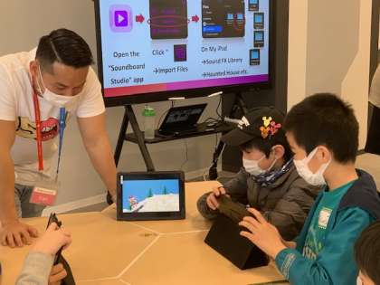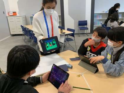 効果音づくりのチームでは、無声のレゴアニメに、タブレットから効果音を選んで、そのアニメーションの中で適切な音が出るようにしています。
