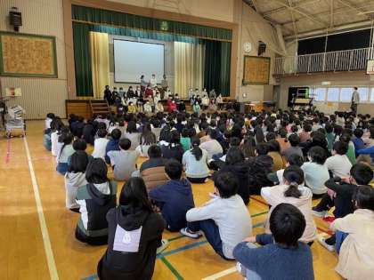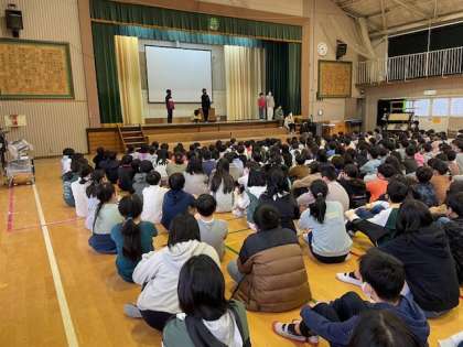 ふれあい朝会にて、5年生がいじめ防止を提言しました。今年度の6年生は、昨年度、「いじめ、ダメ、絶対」を寸劇にしました。今年度の5年生は、いじめが想定される場面の寸劇と群読で、全校児童にいじめ防止を提言することができました。